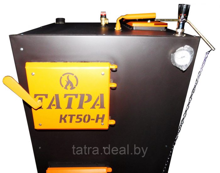 Котел состоит из двух основных частей ― камера сгорания и теплообменника. Камера сгорания или, вернее, топка в пиролизных котлах состоит из двух секций: камеры загрузки и камеры сгорания. В первой камере (загрузки) топливо сгорает медленно и пиролизуется, образовывая при этом газы, которые в камере сгорания (второй) под воздействием приточного воздуха разгораются, выделяя основное тепло для нагрева воды в контуре.По своей сути пиролизные котлы являются экономическими так как в нем сгорает все составляющие топлива. Помимо этого, процесс горения у котлов такой мощности происходит в течении от 6 часов до 16 часов, в зависимости от способа подачи воздуха. Для сравнения у обычных твердотопливных котлов, работающих на древесном топливе, это время составляет порядка 3 часов. Недостатком этого типа котлов является их более высокая стоимость по сравнению с обычными, сложность конструкции и высокая требовательность к влажности дров. Но благодаря тому, что у данной модели вторичный воздух подается не через форсунку, как в стандартном газогенераторе, а при помощи газифицирующей трубки, мы немного снизили качество дожига пиролизных газов, но при этом нам удалось также значительно снизить требования к качеству сжигаемого топлива. Поэтому данный котел может работать на одной закладке топлива как хороший газогенератор 6 и более часов, а основной вид топлива, которое он потребляет не дрова технической сушки, а обычная древесина подвергнутая естественному старению под навесом в течении года и более.) Водонагреватель оснащен вертикальной топкой глубиной 550мм и высотой 1300мм с двумя загрузочными дверцами для облегчения равномерной укладки поленьев. Повышенная эффективность водонагревателя достигнута путем максимального использования пространства внутри котла, полностью охлаждаемая топка со всех сторон, окружена полыми стенками с теплоносителем, расположение всех элементов в боковом теплообменнике рассчитано на полную отдачу тепла от продуктов сгорания. Все твердотопливные котлы серии ТАТРА оснащены охлаждаемыми колосниками, не требующими замены на протяжении всего периода эксплуатации.